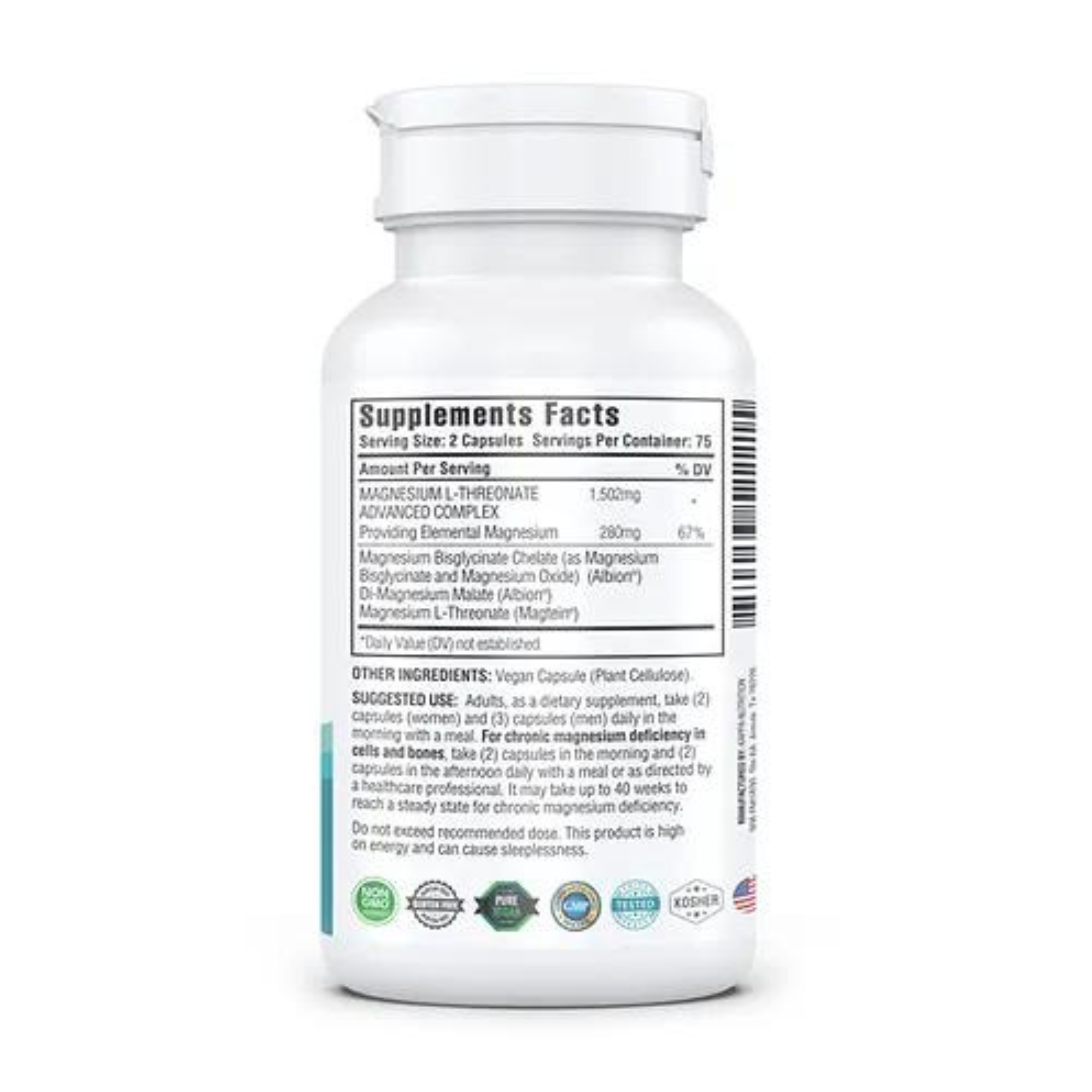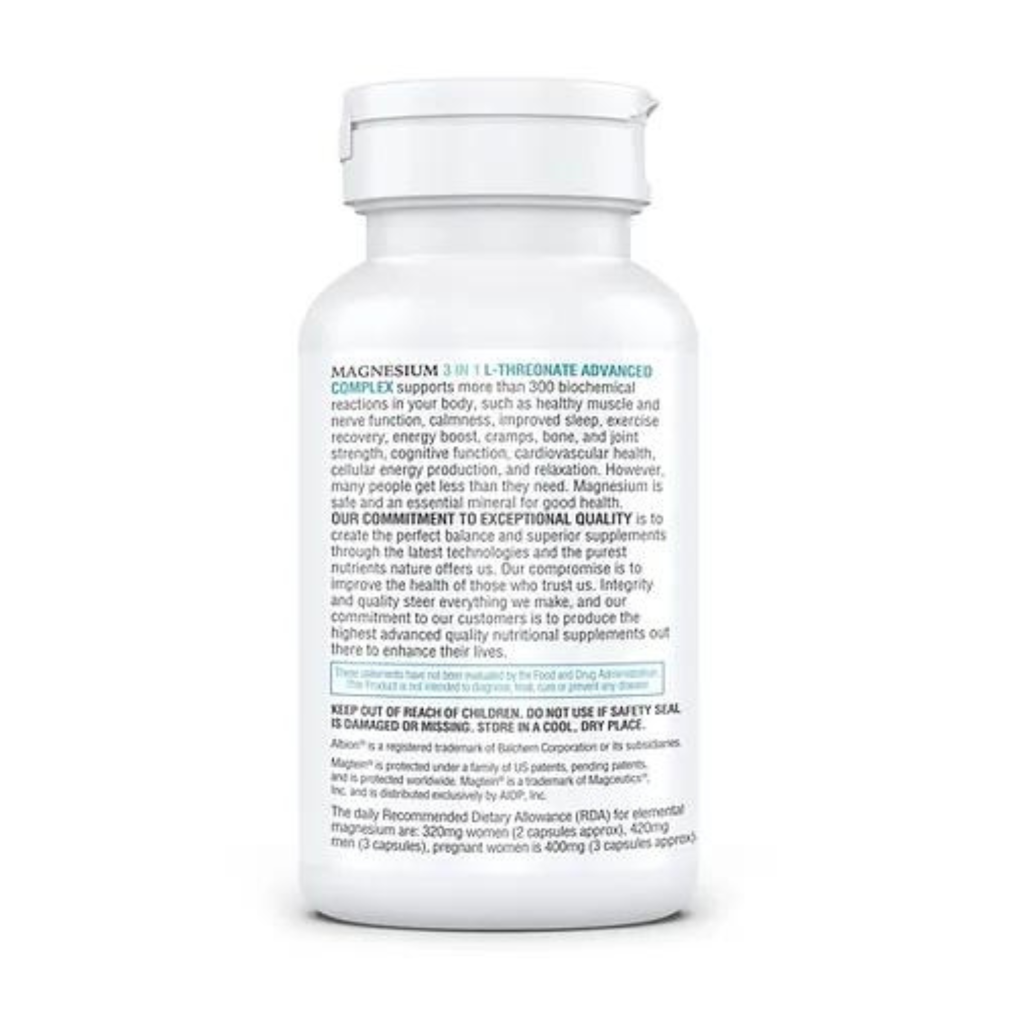 Magnesio (como quelato de bisglicinato de magnesio tamponado: quelato de bisglicinato de magnesio, óxido de magnesio (Albion®) + malato de dimagnesio (Albion® + L-treonato de magnesio (Magtein®)